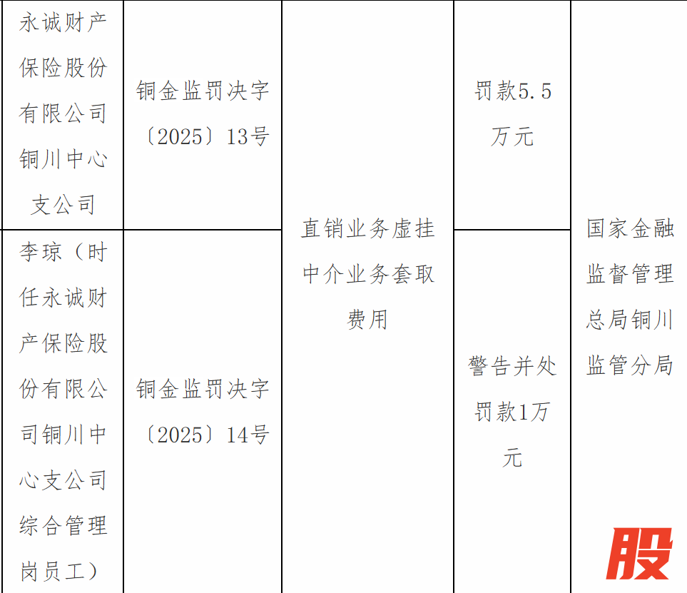 1月4日,国家金融监督管理总局铜川监管分局行政处罚信息公开表显示,永诚财产保险股份有限公司铜川中心支公司因直销业务虚挂中介业务套取费用被罚款7.5万元;李某被警告并罚款1万元。